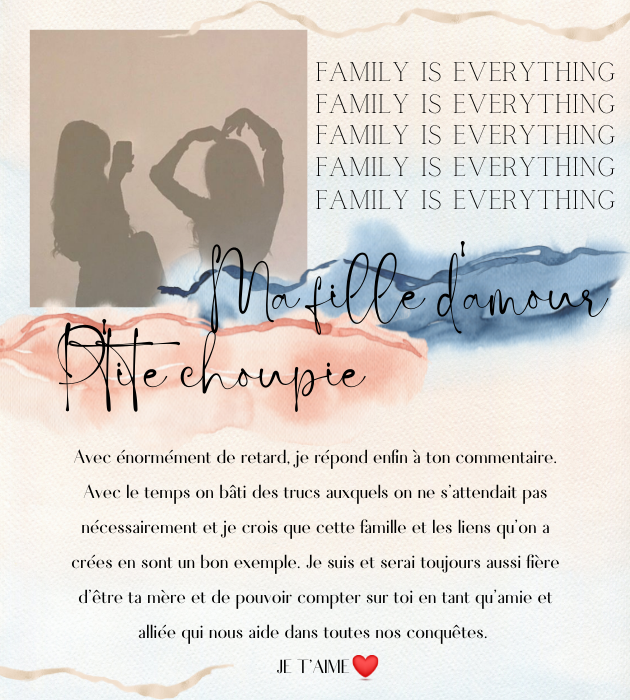 Ma très chère grande soeur, je me devais te faire ce petit commentaire car une grande soeur c'est précieux et tu es précieuse dans ma vie et je te remercie d'être toujours là pour moi. Tu es toujours là pour tout le monde et c'est touchant. Sache que je t'aime aussi et que si besoin, je serais toujours là pour toi. le 26 janv. 2022