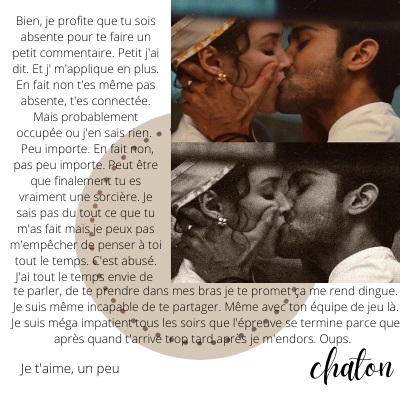 L'envie me prend de t'appeler tel, c'est peut être un simple excès d'émotions porvisoire provoqué par tes mots, ou peut être bien plus que cela. Ça a toujours été la marée dans ma tête, mais avec toi elle est encore plus lunatique, car elle te connaît et elle vit en toi comme elle vit en moi. Cette marée qui nous rend malsaines. Tout d'abord j'ai eu envie de te répondre avec une simple caresse au creux de tes reins, une caresse qui traduirait tous mes mots non prononcés, puisque de toute manière, toi et moi, on a jamais eu besoin d'en dire beaucoup. Mais c'est un baiser que je veux, mon âme en a besoin pour être nourrie. Je sais que la tienne est tout aussi affamée, elle l'est bien plus souvent que la mienne, insatiable qu'elle est. Alors je viens t'offrir ma faim pour que tu t'en nourrisses, réclamant la tienne en retour. Je t'embrasse bébé, avec goût mais sans dégoût, avec une seule de mes facettes, celle qui somnole depuis un bout de temps, mais qui s'est réveillée à la vue de tes lèvres.
