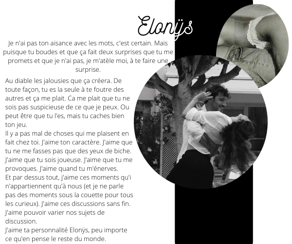 Je t’avoue que je ne me souviens pas comment on s’est connue. Je pense qu’on s’est parlé sur la pp, mais après ça, le trou noir. J’ai un peu une mémoire de poisson rouge je t’avoue, mais anyway, je suis contente de t’avoir connu, de te connaître et de te découvrir un peu plus chaque jour. T’es une femme forte, tu as un caractère bien à part et c’est ce que j’aime le plus chez toi. Tu te laisses pas faire. A STRONG INDEPENDANT WOMAN ; we love to see that. Tu es devenue une personne importante pour moi, et je sais que je le montre peut-être pas assez, mais je t’aime, et j’aime t’aimer comme tu es.  Kisskiss Elonys. Ps : nos ptits pv hot me manquent. (a)