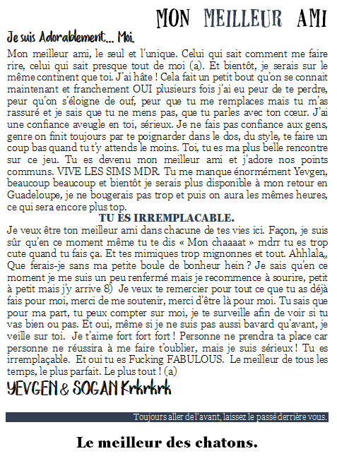 Oui je crois que c'est un peu ça l'amour. Ça décuple tout. C'est la meilleure des drogues, mais peut-être aussi la pire parfois. Vraiment être amoureuse de toi, c'est comme prendre un joint le matin pour commencer la journée. C'est les mêmes sensations. Je veux ma dose de Yev chaque matin, chaque soir. Je veux tes mots, ta voix, qui berce mes journées. Jusqu'à ce je trouve le chemin de tes bras pour m'apaiser. J'espère que présentement, pendant que j'écris ces quelques lignes, tu fais de doux rêves, agrémenter de jupe trop courtes, dénué de sous-vêtements, avec un peu de moi, le tout saupoudré d'amour. Que ton réveil soit des plus agréables. Que cette journée soit parfaite, pour que ton sourire ne quitte jamais ton visage. J'espère que j'ai été une bonne infirmière, et que j'ai pu aidé pour le deuil de ta femme. Qu'elle ne se retourne pas trop dans sa tombe. Elle n'a pas à s'en faire, je prendrais soin de son cher époux. Avec Amour.